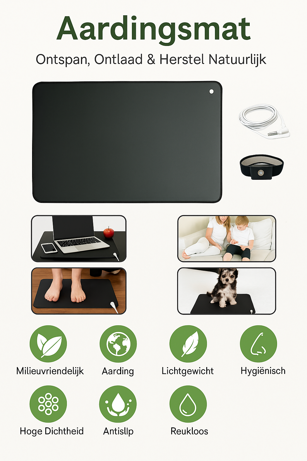 Onze moderne omgeving zit vol elektrische spanning en kunstmatige energiebronnen. Deze aardingsmat helpt je lichaam om die spanning los te laten en weer in balans te komen.
